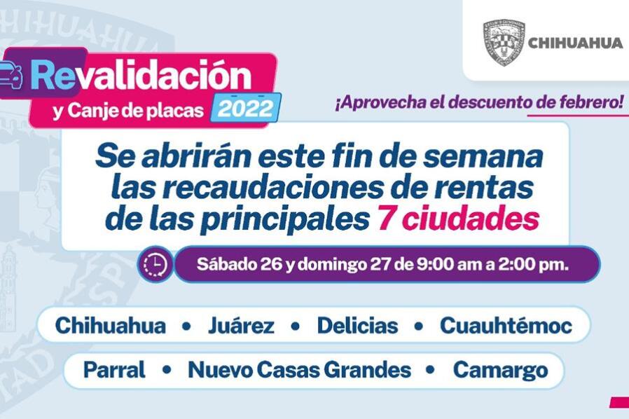 Chihuahua, Chih.- La Secretaría de Hacienda informó que los días sábado 26 y domingo 27 de febrero del presente se abrirán las siete principales recaudaciones de rentas de la entidad, ubicadas en las ciudades de Chihuahua, Juárez, Delicias, Cuauhtémoc, Parral, Nuevo Casas Grandes y Camargo, en apoyo a los contribuyentes por cierre de incentivos, del mes de febrero, para el pago de canje de placas y revalidación vehicular 2022.