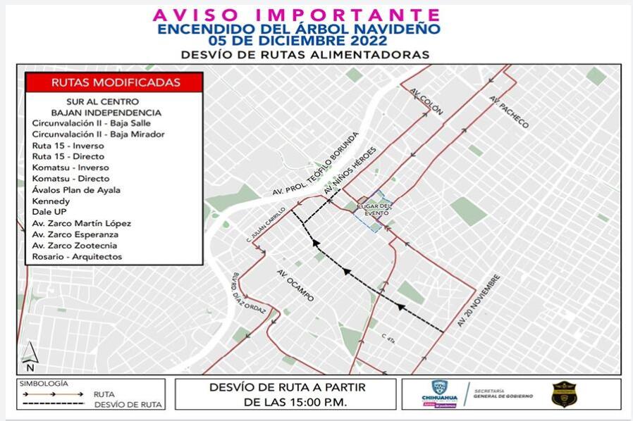 Chihuahua, Chih.- Con motivo del tradicional encendido del Árbol Navideño, este lunes 5 de diciembre se cerrará al desplazamiento de vehículos el tramo de la Plaza del Ángel por avenida Venustiano Carranza, por lo que se verán modificadas de manera temporal 16 rutas del servicio de Transporte Colectivo Urbano.