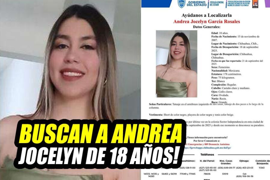 Chihuahua, Chih.- La Fiscalía del Estado solicita el apoyo ciudadano para encontrar a Andrea Jocelyn García Rosales, de 18 años, reportada como desaparecida desde ayer en la colonia Sector Independencia de Chihuahua.