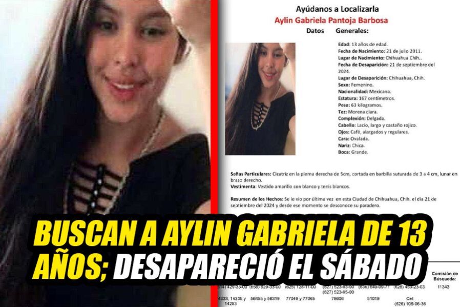 Chihuahua, Chih.- La menor Aylin Gabriela Pantoja Barbosa, de 13 años, se encuentra desaparecida desde el pasado 21 de septiembre en la ciudad de Chihuahua. Sus familiares informaron que fue vista por última vez al salir de su domicilio y desde entonces no se ha tenido noticias sobre su paradero.