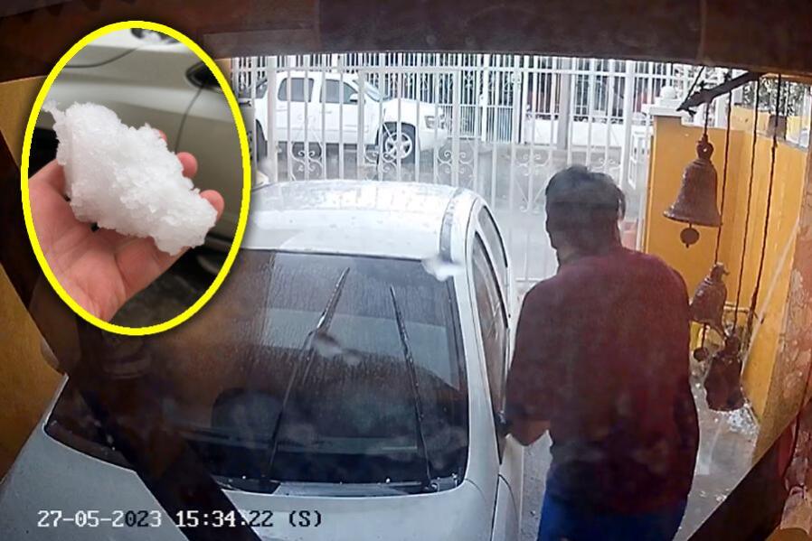 «Cuidado con la cabeza», se escucha decir a una mujer en uno de los videos que circulan en redes cuando un familiar intentaba acercar un vehículo a una cochera para evitar que fuera golpeado por el granizo.