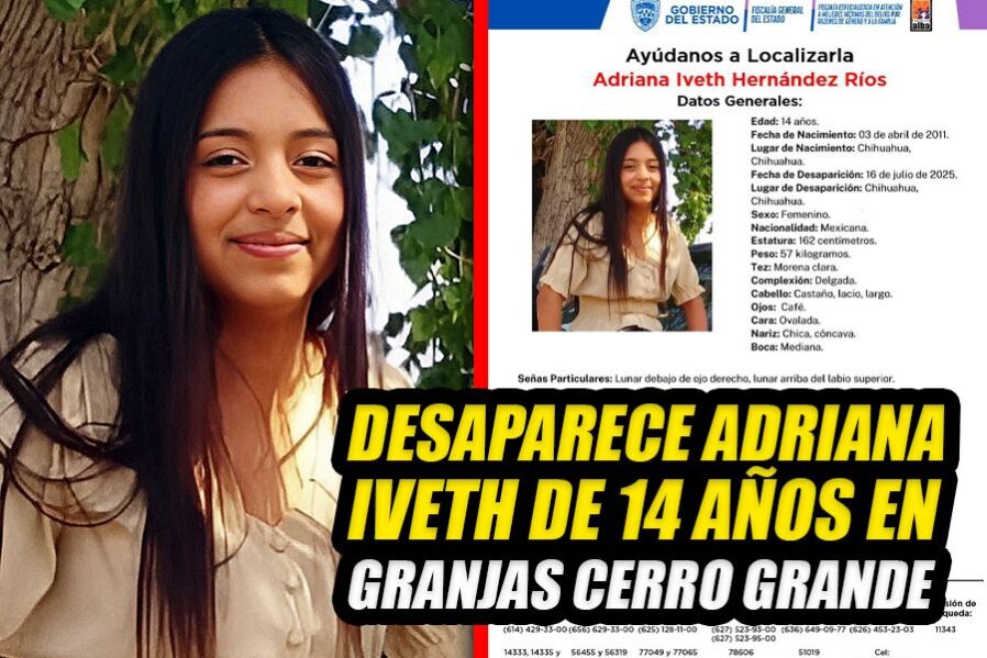 Chihuahua, Chih.- La adolescente Adriana Iveth Hernández Ríos, de 14 años, se encuentra desaparecida desde el miércoles 16 de julio, cuando fue vista por última vez al sur de la ciudad de Chihuahua, en la colonia Granjas Cerro Grande.