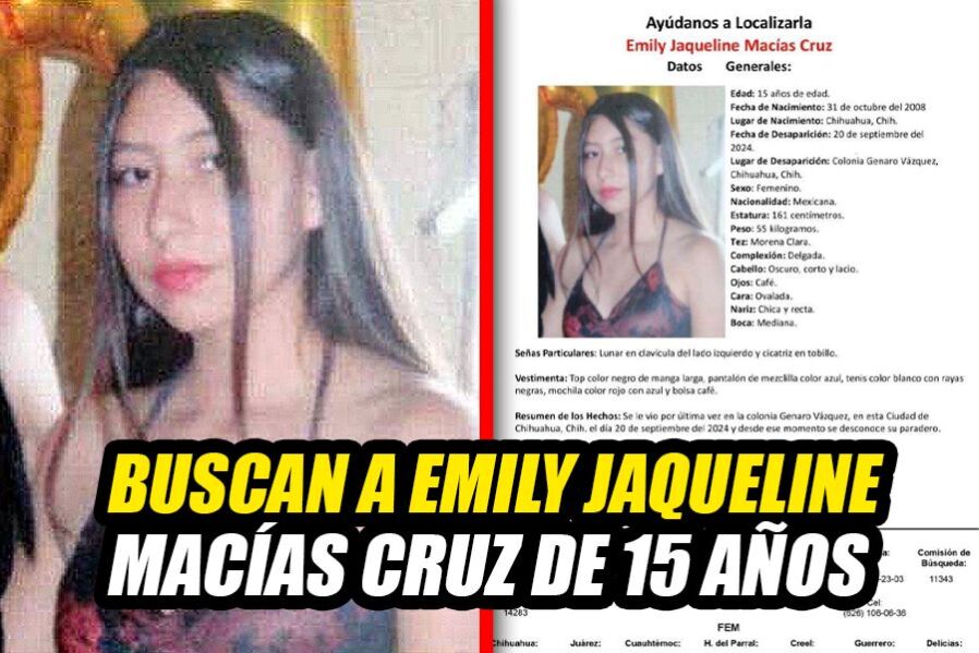 Chihuahua, Chih.- La adolescente Emily Jaqueline Macías Cruz, de 15 años, se encuentra desaparecida desde el viernes 20 de septiembre en la ciudad de Chihuahua.