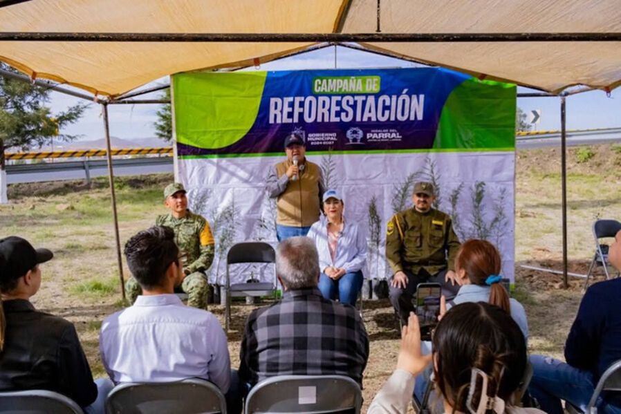 Chihuahua, Chih.- Con el objetivo de fortalecer el cuidado del medio ambiente y avanzar hacia una ciudad más sostenible, el presidente municipal de Parral, Salvador Calderón, acompañado de su esposa Nora Carrillo, encabezó una jornada de reforestación en la que se plantaron 100 árboles de pino y encino en las inmediaciones del 76/o Batallón de Infantería.