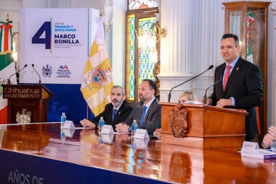 Chihuahua, Chih.- En sesión solemne de Cabildo, el alcalde Marco Bonilla entregó a las y los regidores su Cuarto Informe de Gobierno, en el que destacó avances en seguridad, economía, calidad de vida, infraestructura y transparencia.