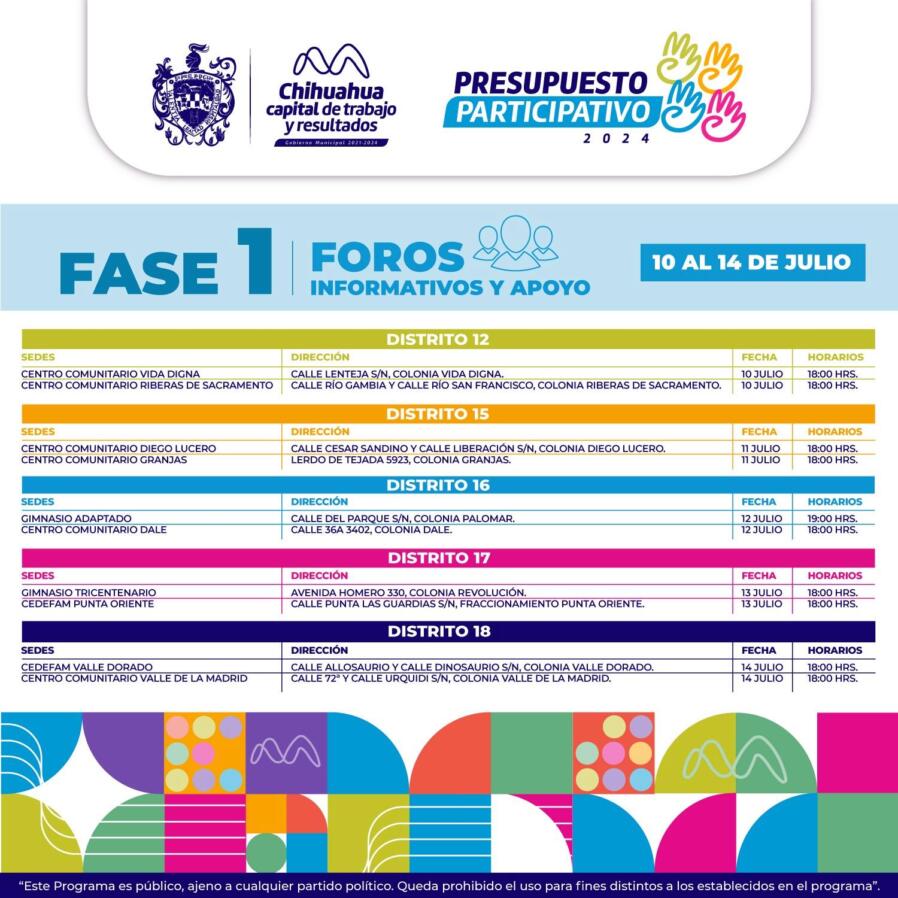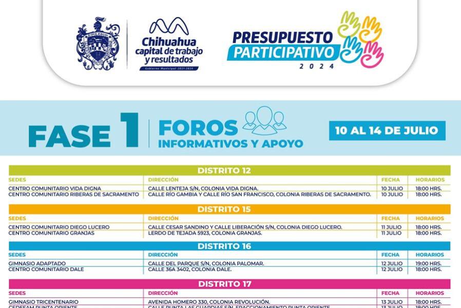 La recepción de documentos para registrar tu propuesta concluye el día 18 de agosto, puedes informarte y realizar tu proceso en línea, en la página https://www.municipiochihuahua.gob.mx/DDHE/Presupuesto_Participativo o acudir a la Dirección de Desarrollo Humano y Educación, en la calle Tercera y Ojinaga número 300, segundo piso.