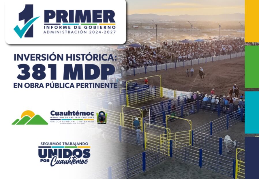 Cuauhtémoc, Chih.- En este primer año de gobierno del alcalde Beto Pérez se informa sobre una inversión en obra pública que supera los $381 millones de pesos, la cual no solo mejora la calidad de vida de las familias, sino que también promueve la práctica del deporte, el aumento del turismo y el crecimiento económico.