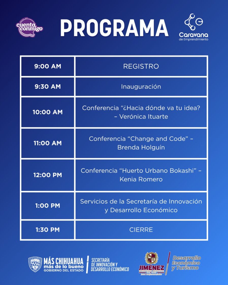 Además, se contará con módulos de información y asesoría del Instituto de Apoyo al Desarrollo Tecnológico (Inadet), la Fundación del Empresariado Chihuahuense A.C. (Fechac), el Sistema de Apertura Rápido de Empresas (SARE), la Dirección de Desarrollo Económico y Turístico del Municipio, el Tecnológico Nacional de Jiménez, el Instituto de Capacitación para el Empleo del Estado de Chihuahua (Icatech), el Instituto de Innovación y Competitividad, la Canaco Servytur, y el Fideicomiso Estatal para el Fomento de las Actividades Productivas en el Estado de Chihuahua (Fideapech).