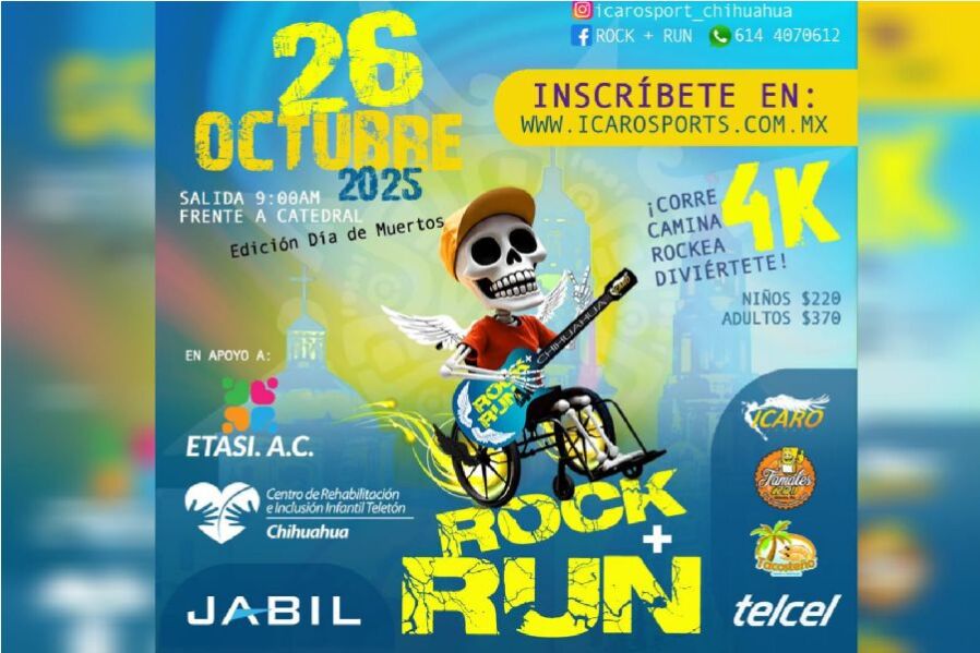 Chihuahua, Chih.- ¡Ayúdanos a correr por una gran causa! Te invitamos a difundir la Carrera 4K Rock & Run 2025 – Edición Día de Muertos, organizada en conjunto con Ícaro Sports, la cual tendrá lugar este domingo 26 de octubre a las 9:00 a.m., con salida frente a la Catedral de Chihuahua.