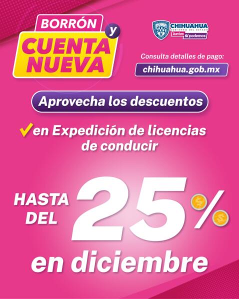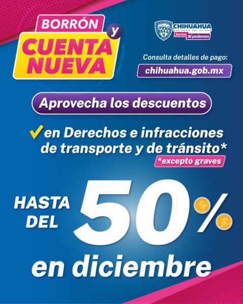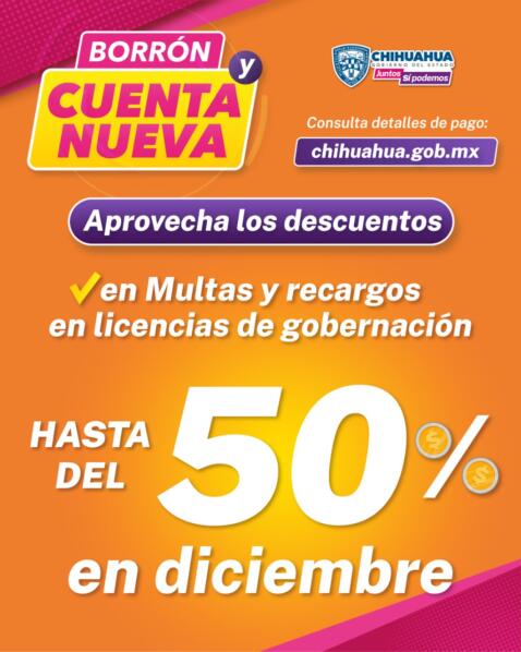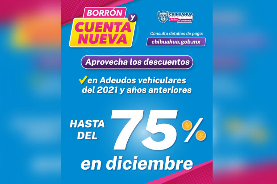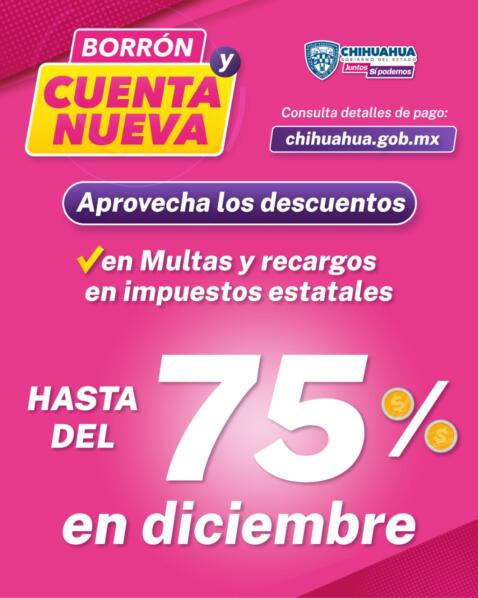 Chihuahua, Chih.- La Secretaría de Hacienda de Gobierno del Estado informa que durante el mes de diciembre continuarán los descuentos del programa “Borrón y cuenta nueva”, por lo que se invita a la población a acudir a realizar su pago para ponerse al corriente en sus adeudos en impuestos estatales.