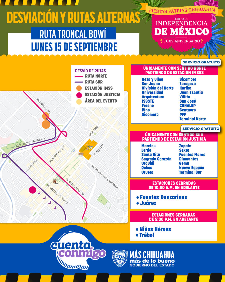 Chihuahua, Chih.- La Secretaría General de Gobierno, a través de la Operadora de Transporte (OTV), informa que con motivo de las celebraciones del Grito de Independencia, el sistema Bowí brindará servicio gratuito a los usuarios, con horario extendido hasta las 2:00 a.m. y un desvío de rutas.