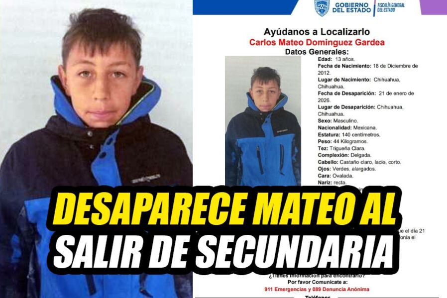 Chihuahua, Chih.- Autoridades y familiares solicitan el apoyo de la ciudadanía para localizar a un menor de 13 años, identificado como Carlos Mateo Domínguez Gardea, quien...