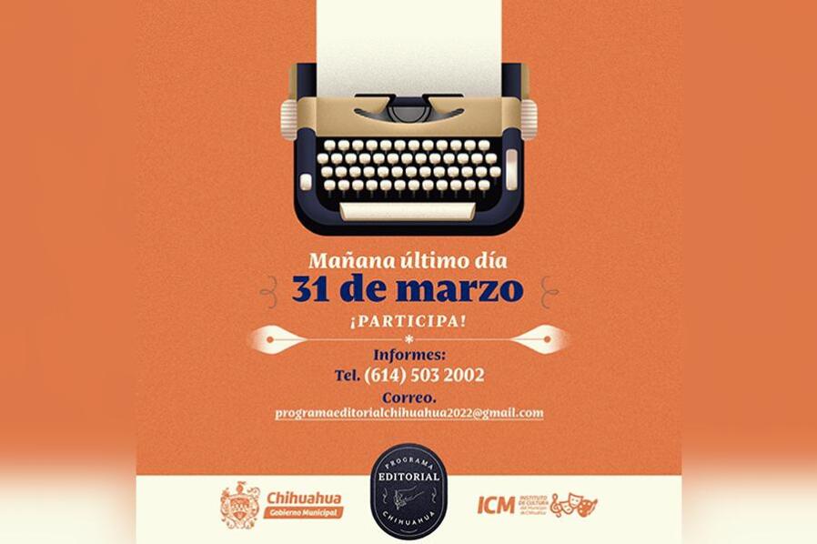 Chihuahua, Chih.- El Gobierno Municipal, a través del Instituto de Cultura del Municipio (ICM), invita a la comunidad de escritoras y escritores chihuahuenses a participar en el Programa Editorial Chihuahua (PECH) en su edición 2022, cuya convocatoria cierra este jueves 31 de marzo en punto de las 16:00 horas.