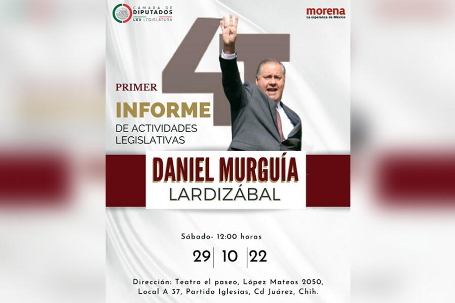 Ciudad Juárez, Chih.- El próximo sábado 29 de octubre el Diputado Federal, Daniel Murguía Lardizábal, presentará su Primer Informe de Actividades.
