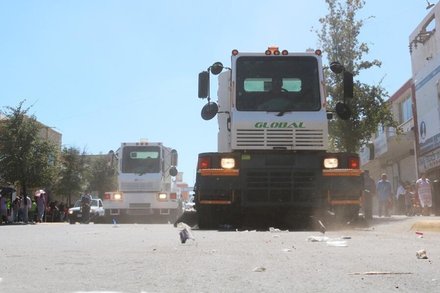 Con tres barredoras y 15 trabajadores manuales, se llevó a cabo la limpieza de las avenidas y calles del primer cuadro de la ciudad al finalizar el desfile por el 16 de septiembre, desde la avenida 20 de Noviembre a lo largo de la avenida Venustiano Carranza, hasta la avenida Juárez.