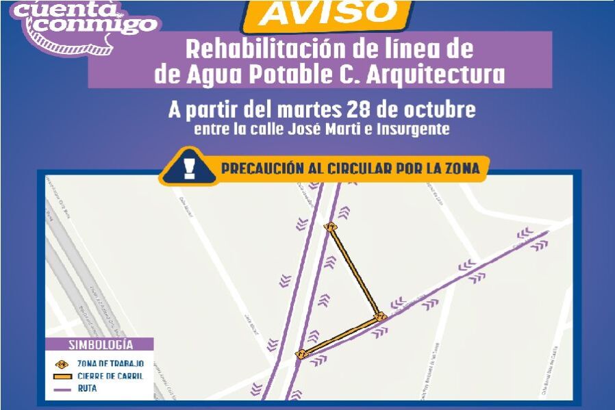 Las maniobras se llevarán a cabo en un horario de 9:00 de la mañana a 2:00 de la tarde, por lo cual será necesario el cierre parcial de las calles Arquitectura, entre José Martí e Insurgentes, y José Martí, entre Insurgentes y Arquitectura.