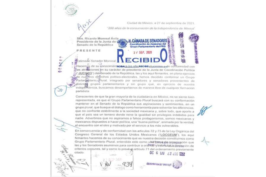 México.- El senador chihuahuense Gustavo Madero Muñoz envió una carta este día 27 de septiembre dirigida al presidente de la Junta de Coordinación Política en el Senado, Ricardo Monreal Macías, en donde le anuncia que abandonará el grupo parlamentario de Acción Nacional para buscar conformar un Grupo Parlamentario Plural.