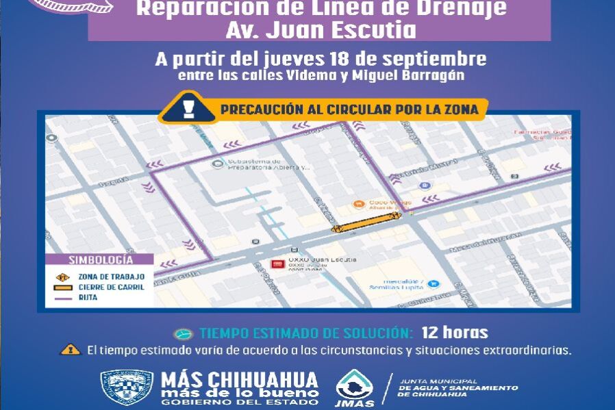 Chihuahua, Chih.- La Junta Municipal de Agua y Saneamiento (JMAS) de Chihuahua informó que este jueves 18 de septiembre llevará a cabo los trabajos de reparación de un tramo de tubería de drenaje en la avenida Juan Escutia, entre las calles Viedma y Miguel Barragán.